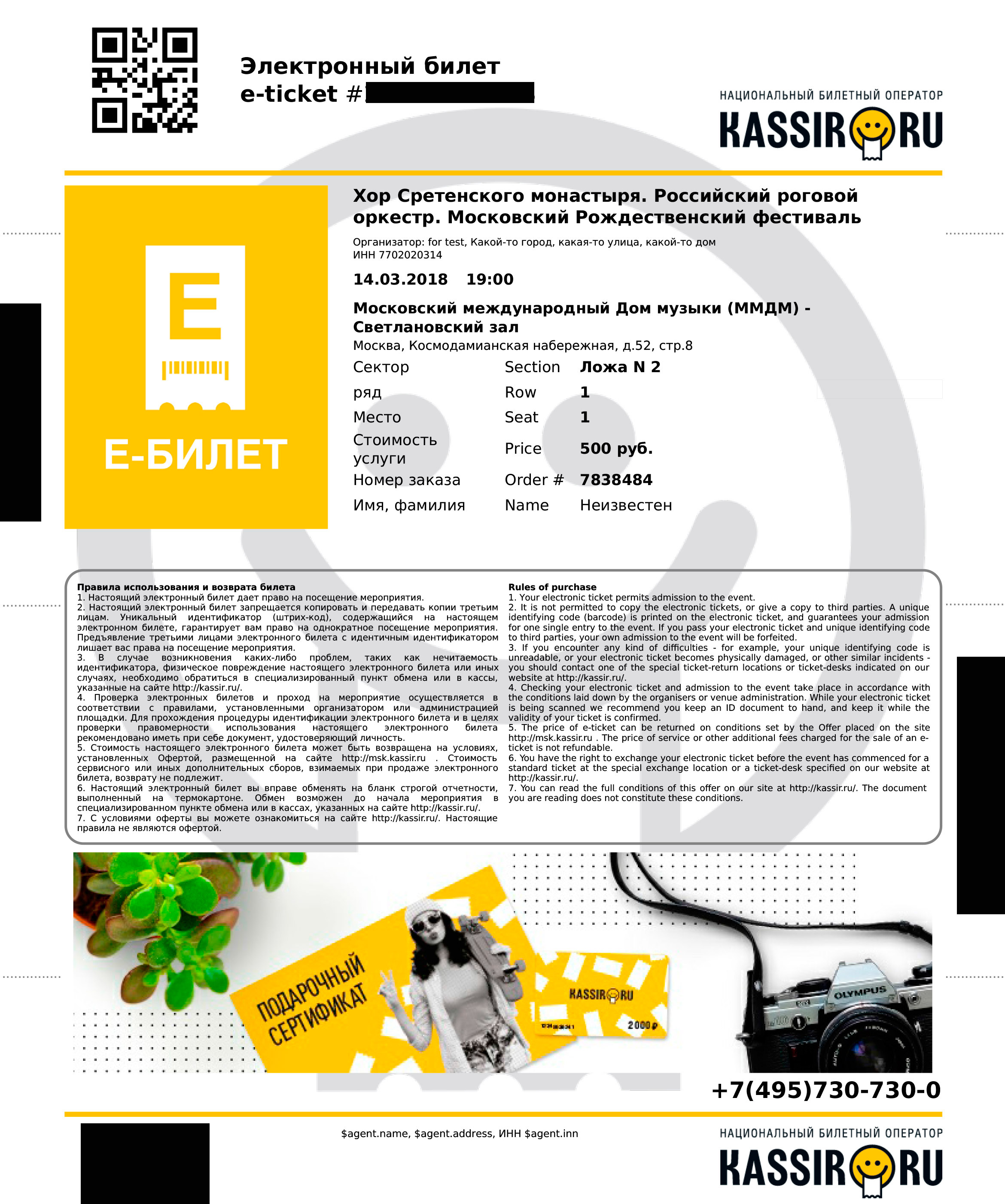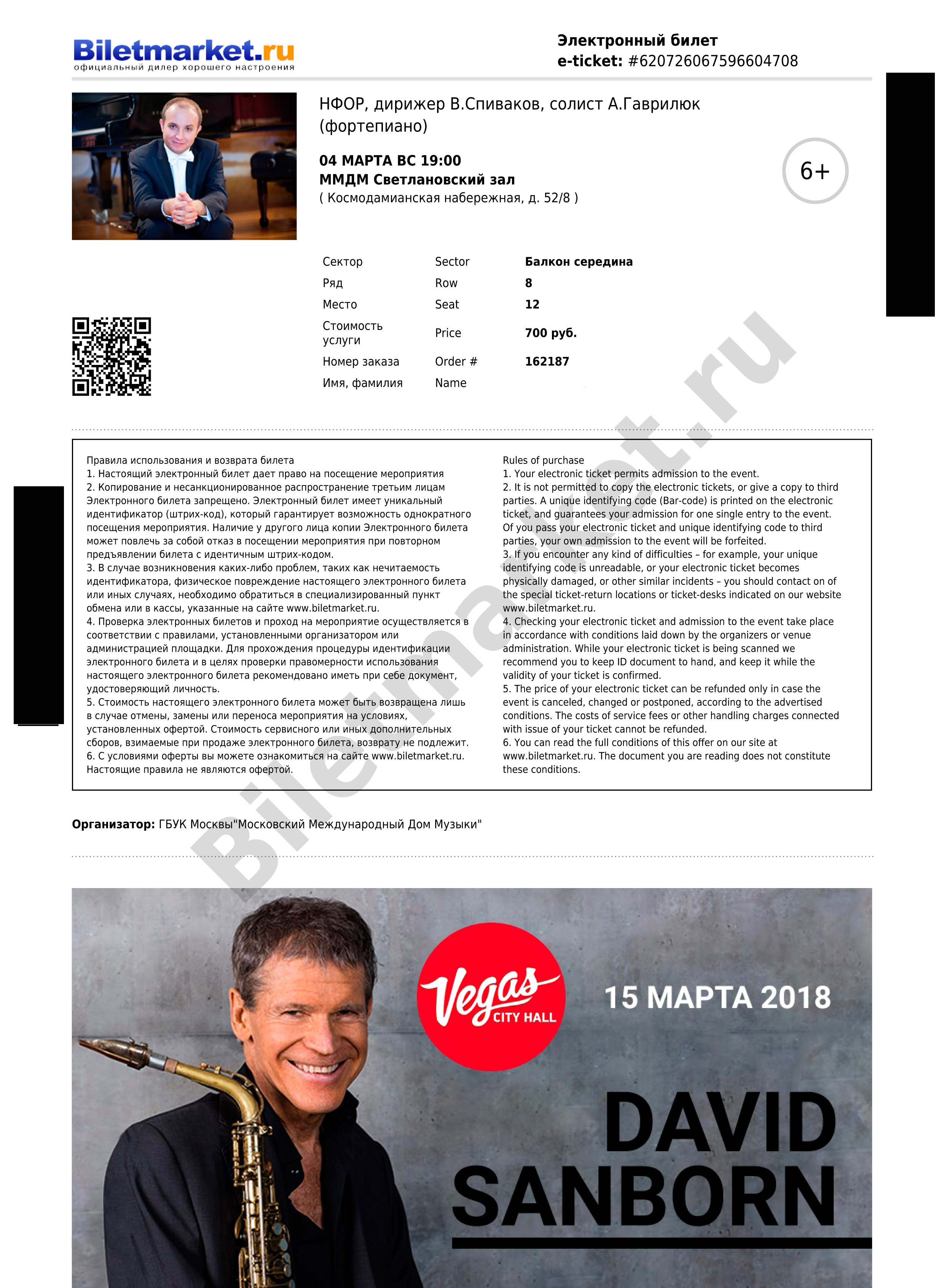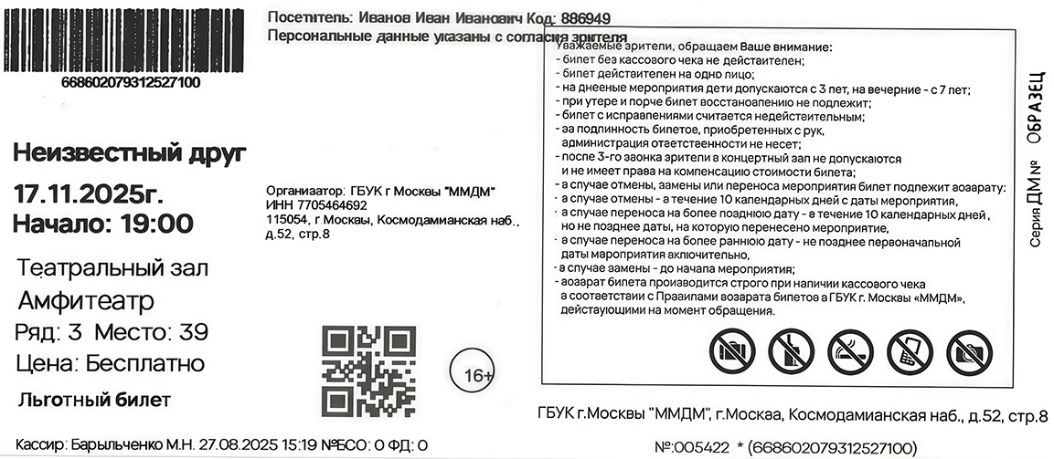 На электронном билете, приобретенном на сайте www.mmdm.ru, должно быть указано: