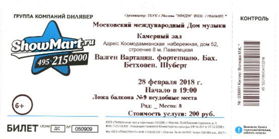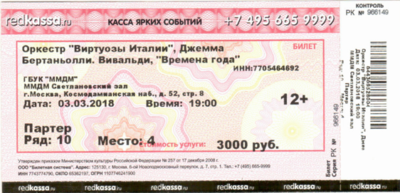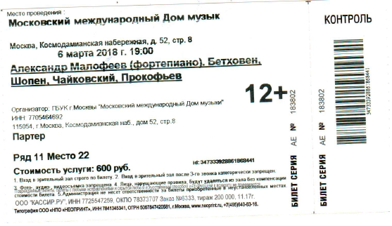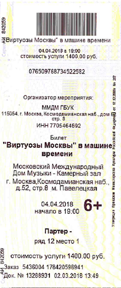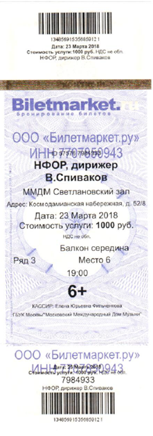 1. Билет ООО «КАССИР. РУ» - официального распространителя билетов Дома музыки на бланке строгой отчетности, изготовленный типографским способом.