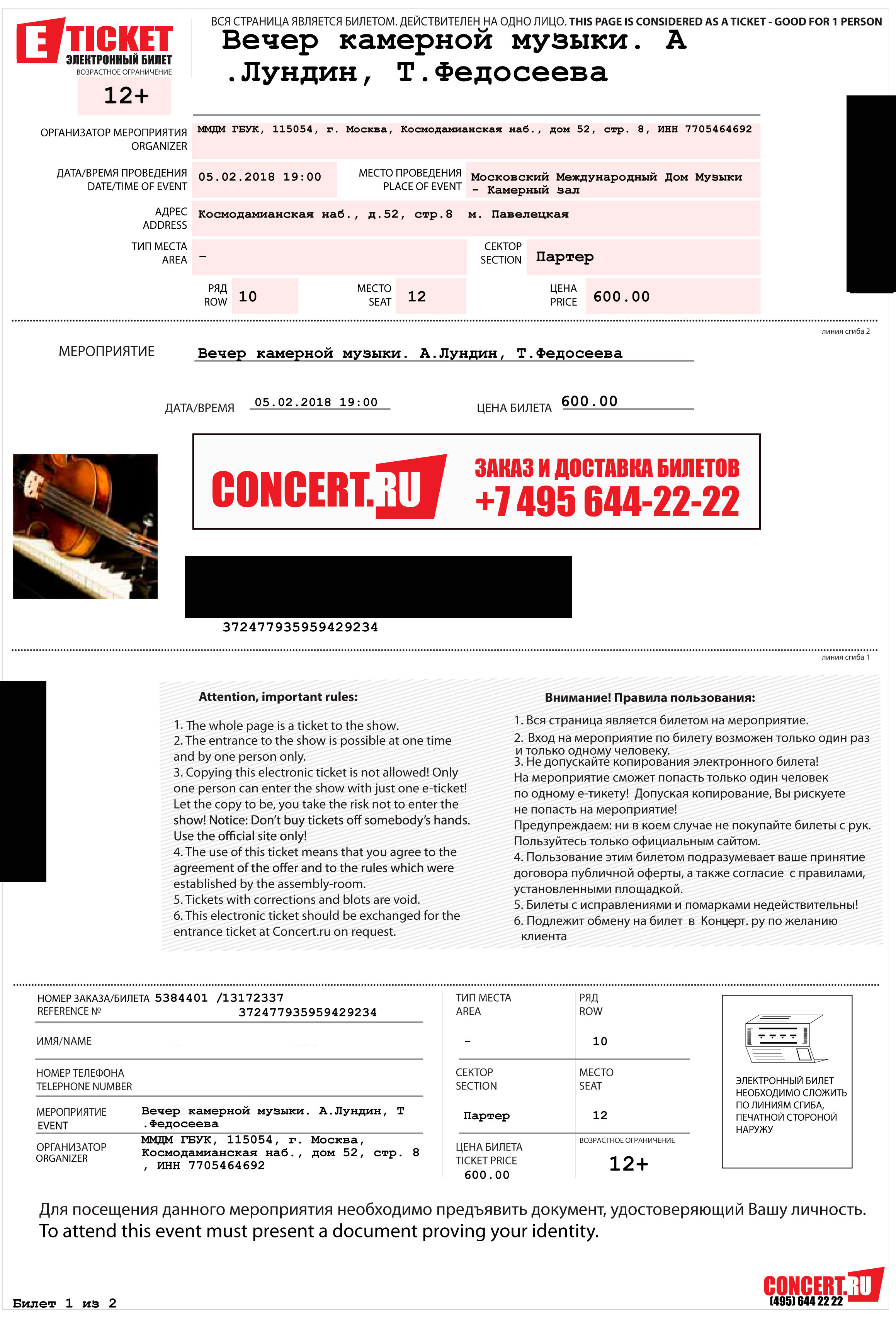 На электронном билете, приобретенном на сайте www.concert.ru, должно быть указано: