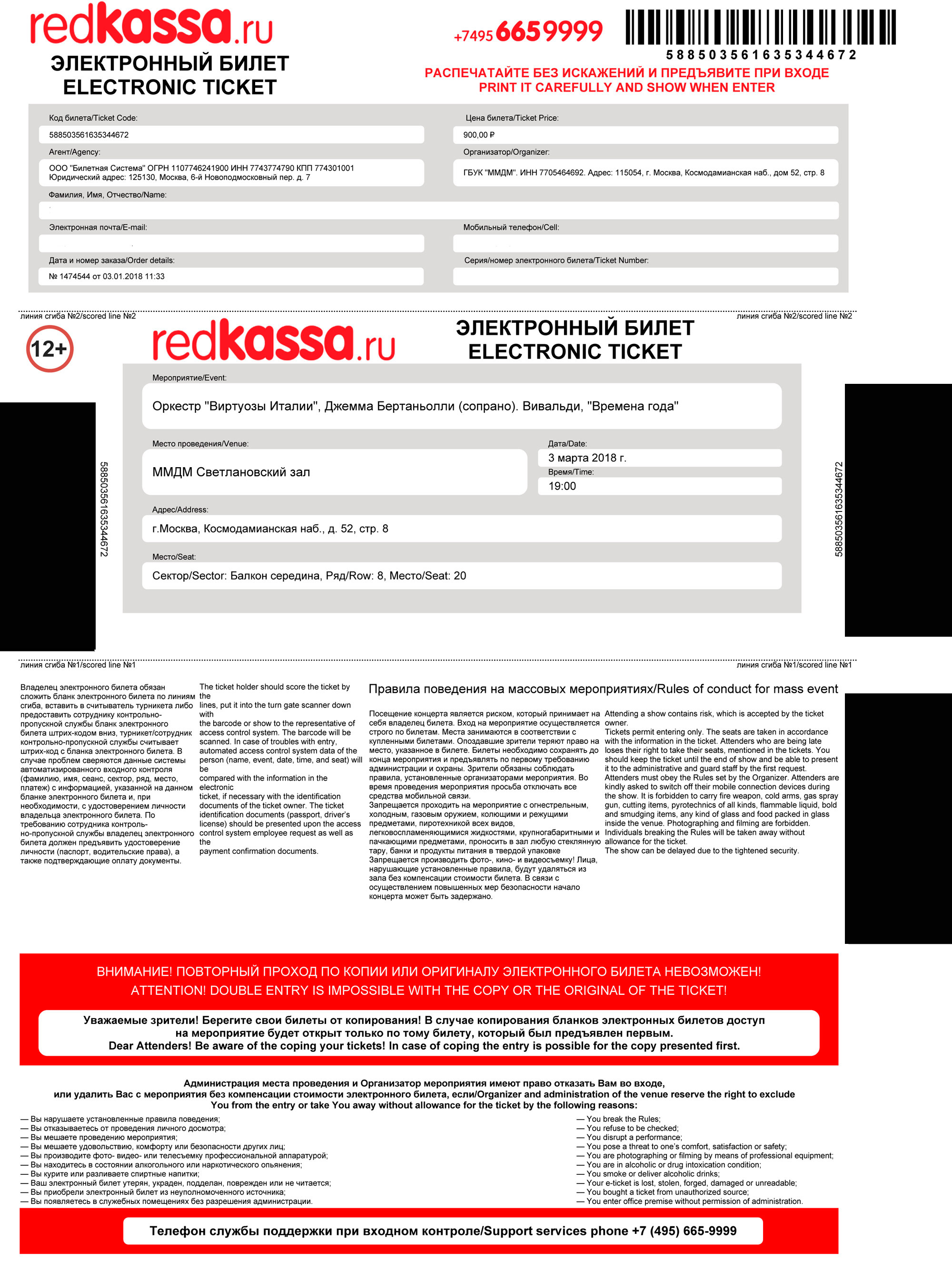 На электронном билете, приобретенном на сайте www.redkassa.ru, должно быть указано: