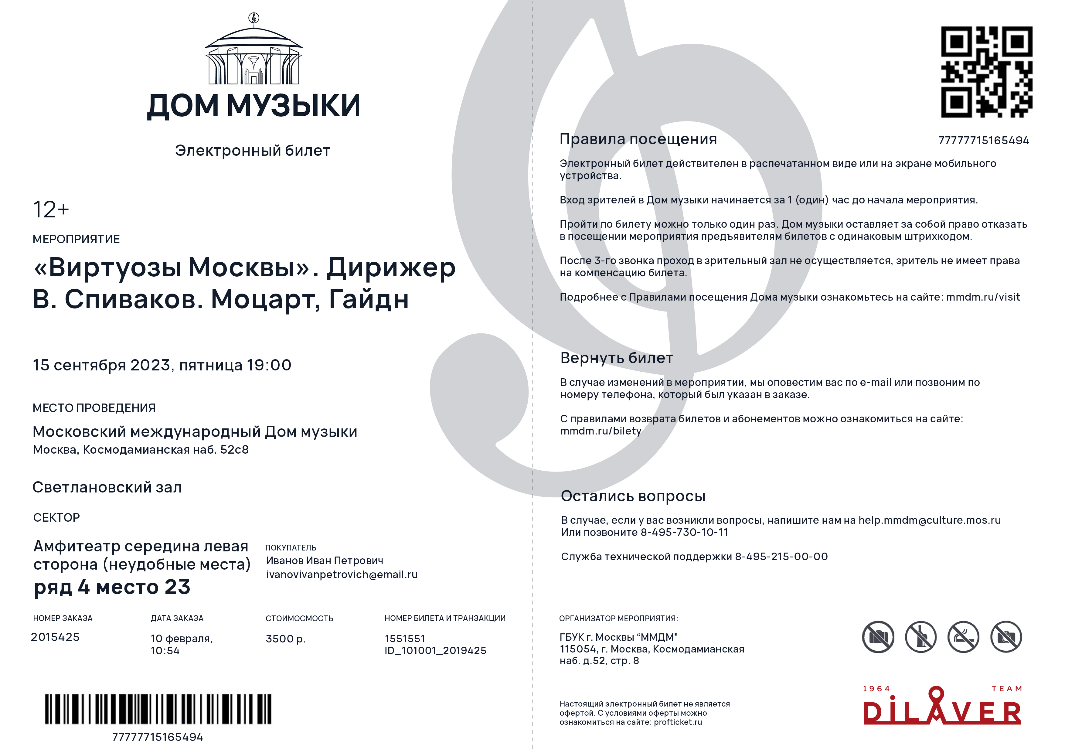 Такой билет приобретается покупателем самостоятельно на сайте Дома музыки www.mmdm.ru, оплачивается собственной банковской картой, предъявляется контролерам в распечатанном виде на обычной бумаге формата А4.