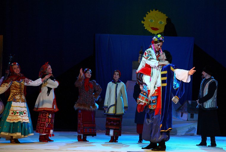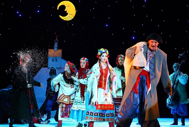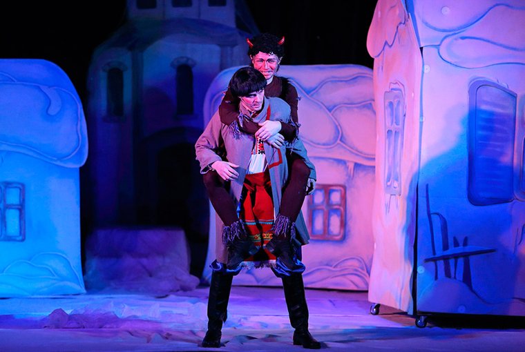 Веселый и красочный мюзикл по одноименной повести Н.В. Гоголя весь пронизан колядками и святочными песнями, украинской и русской народной музыкой. Спектакль перенесет зрителей в маленький малороссийский хутор Диканьку, где в ночь перед Рождеством происходят удивительные чудеса. Черт крадет месяц и всячески пытается испортить людям праздник. Влюбленный Кузнец Вакула чтобы угодить своенравной красавице Оксане летит верхом на Черте к самой Царице за черевичками. Любвеобильная и предприимчивая Солоха – хитрая ведьма – едва успевает «упаковывать» в мешки одного за другим своих незадачливых ухажеров. Но с наступлением Рождества бесовским проделкам приходит конец, а жизнь хуторян становится светлой и радостной.