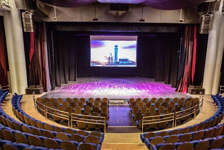 Театральный зал предназначен для многоцелевого использования. Система трансформации партера и сцены с убирающимися первыми пятью рядами кресел партера позволяет изменять пространство зала и создавать разнообразные комбинации расположения зрителей и исполнителей. Соответственно, количество мест в зале колеблется от 400 до 526 в зависимости от вида мероприятия. В этом зале могут проводиться любые виды театрального действа, концерты, показы мод, конференции, презентации и другие культурно-зрелищные мероприятия. Новейшее техническое оборудование делает реальными световые и звуковые эксперименты, а решетчатая структура потолка позволяет подвешивать декорации в любом месте. Цветовое решение зала и фойе выполнено в изысканных фиалковых тонах в сочетании с темно коричневым и серым тонами.